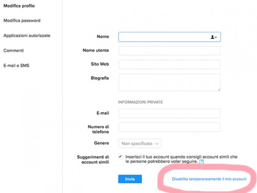 disabilitare temporaneamente un account instagram ccm